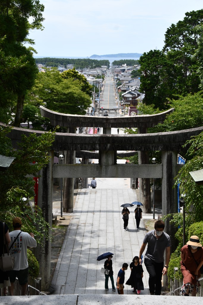 満腹になった3人は次の目的地「宮地獄神社」に向かう。ここは夕陽のタイミングで行くと、一本道と鳥居と夕陽が一直線になってとても綺麗なサンセットを見る事ができる。今回は昼過ぎだったので夕陽ではないが、それでもいわゆる映えスポットだった。