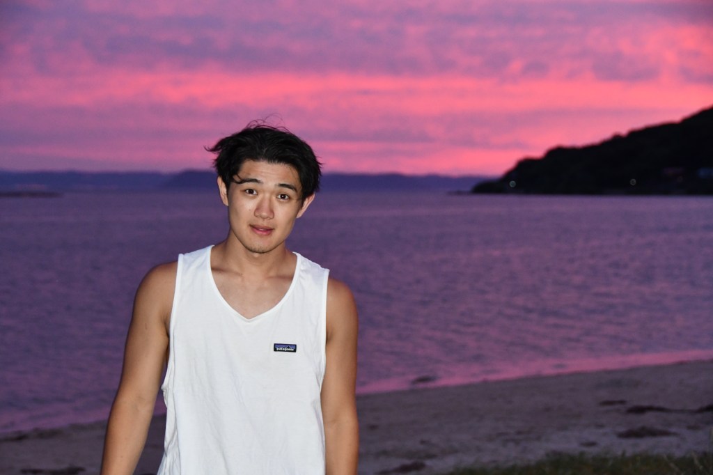 さあ、ここで美しい夕焼けをバックに弟のモデルショットを1枚。